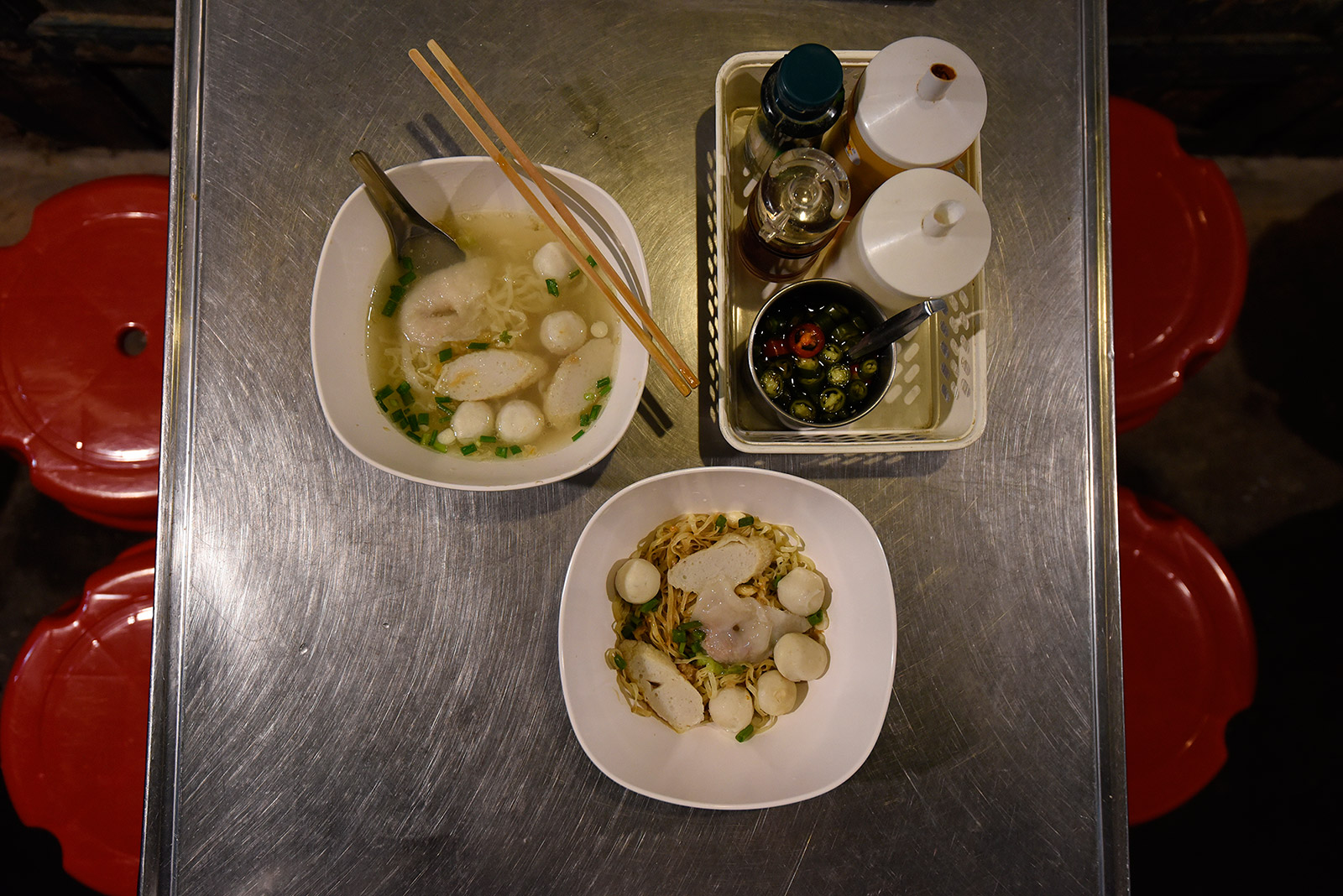 ทีเด็ดอยู่ที่ลูกชิ้นปลาทำใหม่สดทุกวัน เลือกใช้เฉพาะปลาดาบยาวและปลาหางเหลือง ขูดเอาแต่เนื้อแล้วผสมเข้าด้วยกัน บด นวด ให้เป็นเนื้อเดียวจนได้ลูกชิ้นปลาแท้ 100 เปอร์เซ็นต์ เนื้อแน่นเด้งแบบไม่ผสมแป้งและบอแรกซ์ ยังมีเกี๊ยวปลาที่ปั้นด้วยมือทุกขั้นตอน ตั้งแต่นวดเนื้อปลาเป็นแผ่นแล้วใส่เนื้อหมูปรุงรสห่อเป็นตัวเกี๊ยวใช้เวลากว่า 3 ชั่วโมง รวมทั้งฮื่อก้วยก็ทำเองทั้งหมด