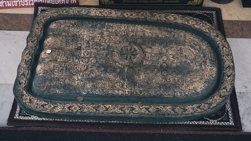 ภายในตลอดทั้งสามชั้นเราจะได้เห็นภาพจิตกรรมฝาผนังเล่าเรื่องราวเกี่ยวกับพุทธศาสนา และแต่ละชั้นจะมีวัตถุมงคลต่าง ๆ ตั้งแสดงไว้ ชั้นสองของเจดีย์มี พระบรมสารีริกธาตุ ที่เป็นส่วนขององค์พระจักษธาตุ ถูกตั้งไว้ให้ผู้คนได้เข้ามาสักการะ ส่วนในชั้นที่สามจะเป็นที่ประดิษฐานรูปหล่อของหลวงปู่ตัน ที่ชาวบ้านเคารพนับถือ