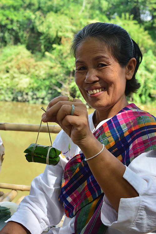 ข้าวต้มที่ใช้ในงานบุญจะเป็นมัดใหญ่ แต่ข้าวต้มที่ให้นักท่องเที่ยวลองทำเป็นมัดเล็ก นึ่งสุกแล้วก็เป็นของว่างยามเบรกให้เราได้ชิมฝีมือกันเอง