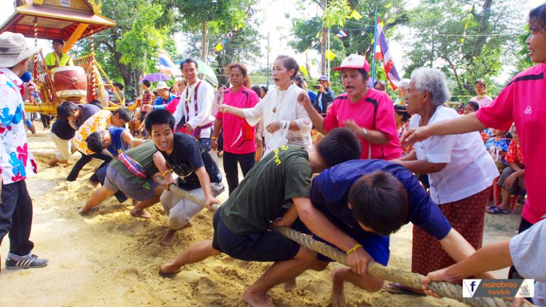 “ดึงอีก … ดึงอีก” กองเชียร์ส่งเสียงลั่น ชาวบ้านในทีมชักเย่อก็ออกแรงสุดชีวิต มือดึง เท้าจิกทราย โน้มตัวลงใช้ประโยชน์จากน้ำหนักตัวให้มากที่สุด แต่ละคนหน้าตาเหยเก กัดฟันสู้ไม่ถอย เสียงกลองรัวเร็วขึ้นเมื่อพวกเขากำลังได้เปรียบ